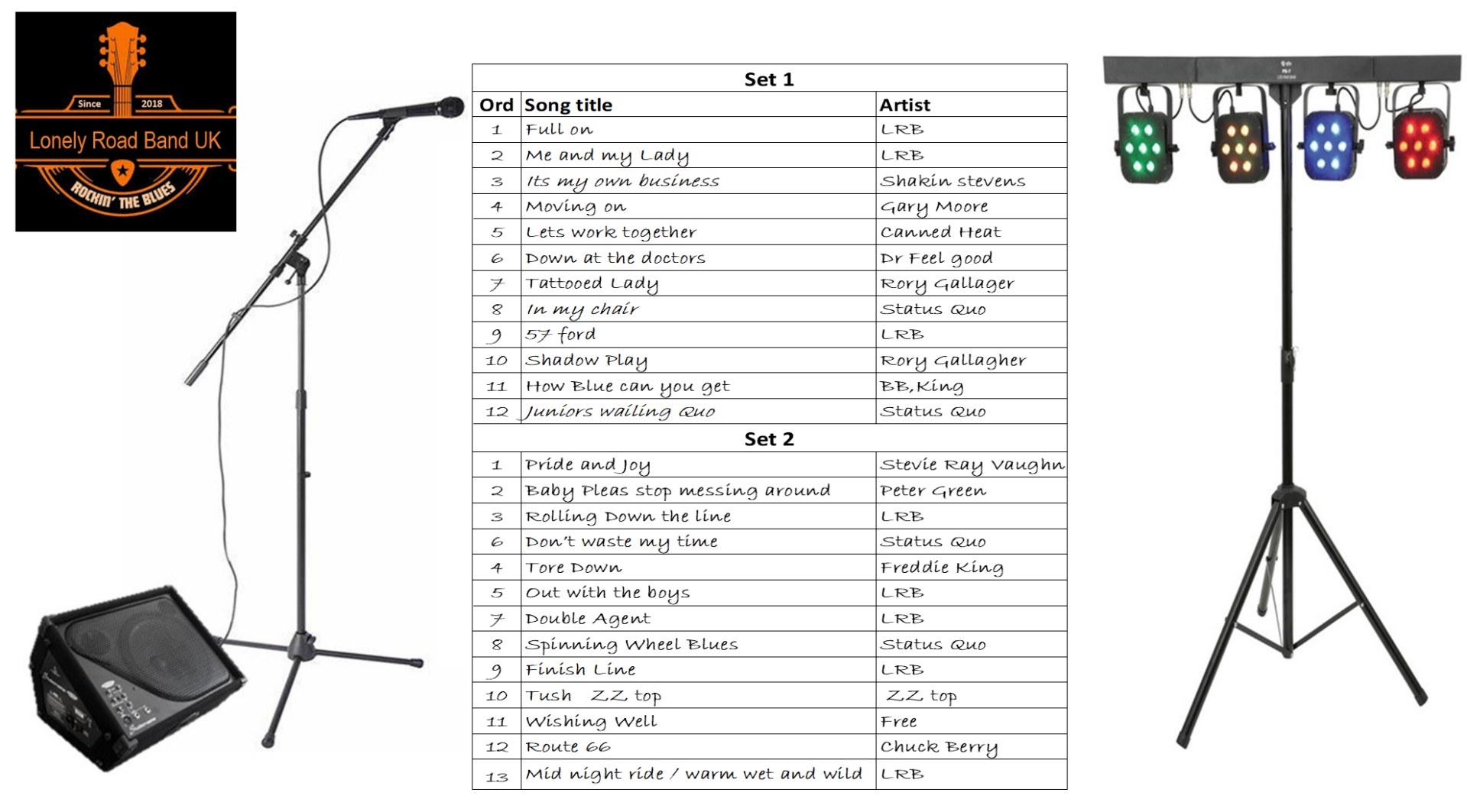 The bands we do covers from are Status Quo, Dr Feelgood, ZZ top. , Canned Heat and Rory Gallagher , Gary Moore plus many more our originals are based around theses artist styles . Our current set we are playing is 75 % covers 25% originals we can play all covers or all originals or a mix depending on the venue .